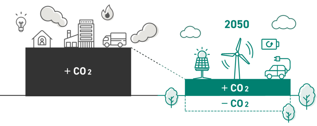 おおまかにいうと温暖化要因の温室効果ガスの一種である二酸化炭素などの排出を抑制しようとする取り組みがカーボンニュートラルなのです。(排出せざるをえなかった量については同じ量を「吸収」または「除去」することで、プラスマイナス0を目指します。)