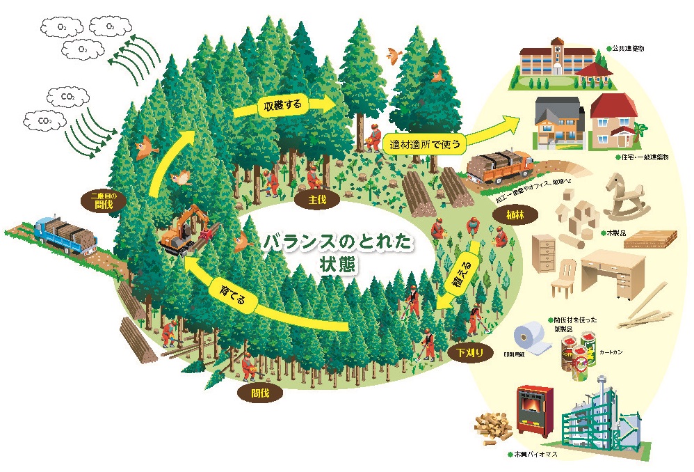 そこで、炭素吸収源のひとつである木材による炭素貯蔵効果が着目されてきました。