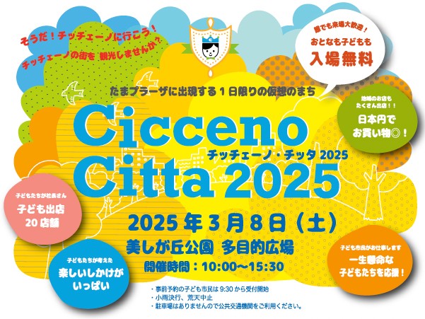 昨年開催した「チッチェーノ・チッタ2024」に続いて、2025年3月8日(土)に美しが丘公園の野球場で開催する「チッチェーノ・チッタ2025」は、まちづくりや自分のお店を出店するこどもたち、当日のみお仕事体験にくる子どもたち、一緒に街を作ってくれる大人出店者さんやボランティアのみなさん、そして高校生、大学生まで全世代が一緒になって1日限りの仮想の街を作る大イベントです。